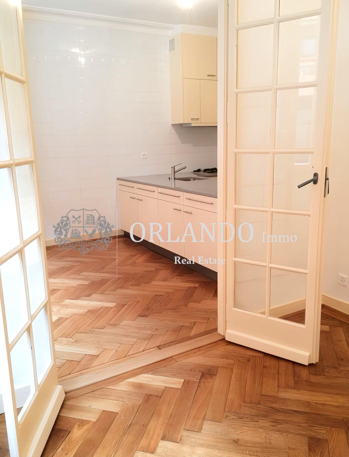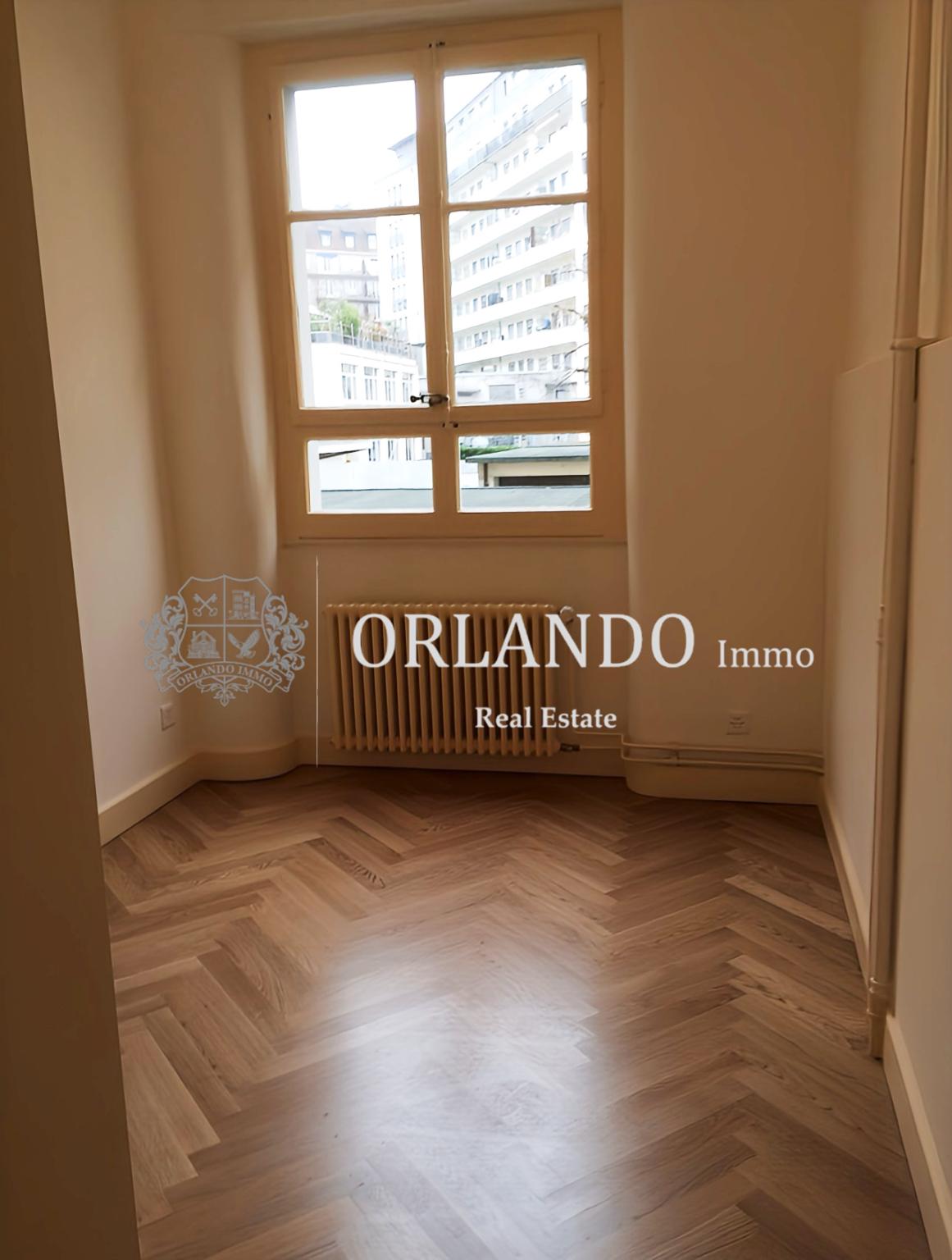 Style ancien avec parquet d’époque et moulures au plafond.