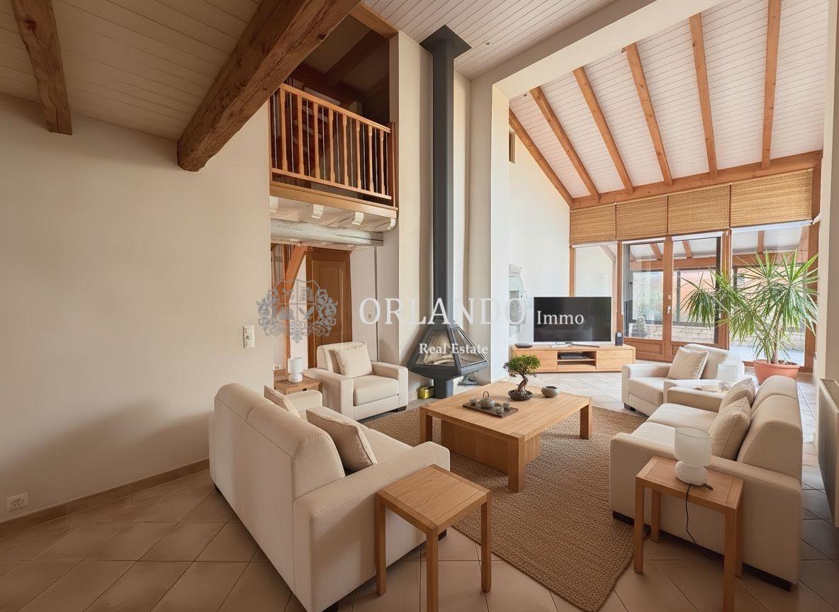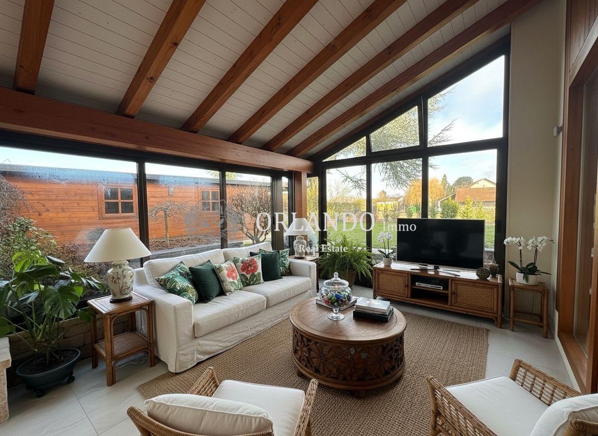 La cuisine entièrement équipée, complétée par un cellier disposant d’un système de climatisation, s’ouvre sur le séjour et crée un espace de vie convivial et fonctionnel. La grande pièce de vie lumineuse est prolongée par une véranda avec accès direct au jardin, offrant une belle continuité entre intérieur et extérieur.